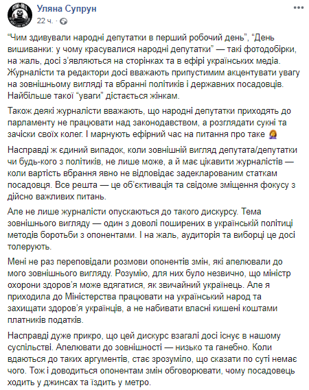 Экс-глава Минздрава Ульяна Супрун заявила, что украинцы должны оценивать не внешний вид и одежду политиков, а их эффективность. Этой теме она посвятила очередной пост в Facebook.