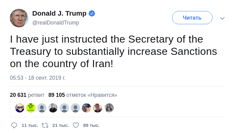 Два дня назад Трамп заявил в Twitter, что поручил министру финансов Стивену Мнучину найти способ существенно ужесточить санкции против Ирана. Поводом для этого стала атака дронов на нефтяное месторождение и завод первичной переработки в Саудовской Аравии.