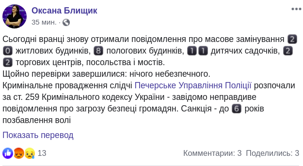 Она добавила, что следователи Печерского управления полиции начали уголовное производство по ст. 259 Уголовного кодекса Украины - заведомо ложное сообщение об угрозе безопасности граждан. Санкция - до 6 лет лишения свободы.