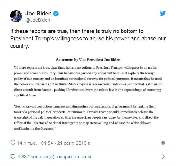 Байден добавил, что  Трамп должен немедленно опубликовать стенограмму звонка, чтобы американский народ сам мог дать оценку, и уполномочить офис директора Национальной разведки рассекретить сообщение.