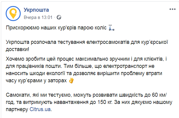 "Укрпочта" провела тестирование электросамокатов для курьерской доставки. Об этом сообщает Facebook-страница предприятия.