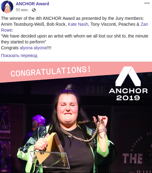 Украинская рэперша Alyona Alyona, которая заявила о себе только осенью 2018 года, получила в Германии международную награду Anchor award. Её ежегодно присуждают самому многообещающему новому артисту. О том, что певица победила в номинации, сообщила пресс-служба награды в Facebook.