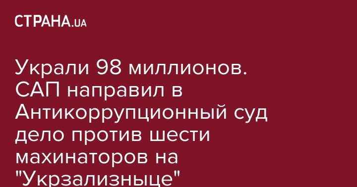 В Высший антикоррупционный суд Украины направлен обвинительный акт в отношении шести лиц, обвиняемых в завладении средствами "Укрзализныци" в сумме около 98 млн грн. Об этом сообщает пресс-служба Специализированной антикоррупционной прокуратуры в Facebook.