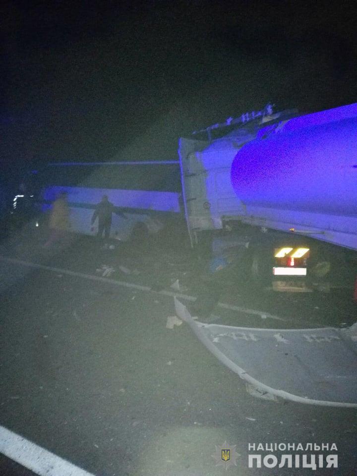 По данным полиции, 55-летний водитель "DAF" с полуприцепом (цистерна), двигаясь по трассе Киев - Чоп в направлении столицы, не справился с управлением и столкнулся с автобусом сообщением "Житомир-Яремча", который стоял на обочине дороги. По имеющейся информации, 66-летний водитель автобуса остановился, чтобы заменить колесо. В момент ДТП часть его пассажиров находились на обочине дороги.