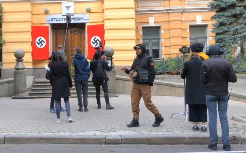 Как выяснилось, нацистская символика оказалась декорациями, а на банковой снимают художественный фильм о фашистской оккупации Киева в период Второй Мировой войны.