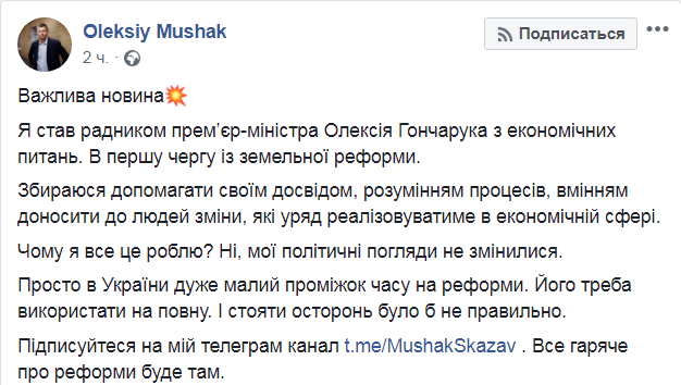 "Я стал советником премьер-министра Алексея Гончарука по экономическим вопросам. В первую очередь по земельной реформе. Собираюсь помогать своим опытом, пониманием процессов, умением доносить до людей изменения, которые правительство будет реализовывать в экономической сфере", - поделился планами Мушак.