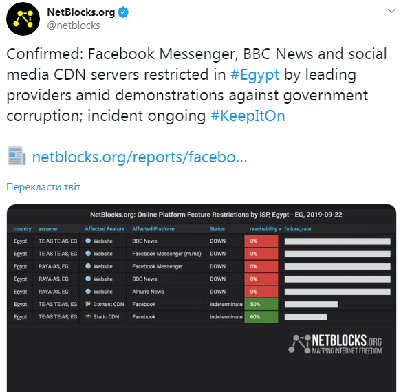 В Египте после начала демонстраций на столичной площади Тахрир начались проблемы с доступом к Facebook, Facebook Messenger и BBC News, а также ряду других интернет-платформ.