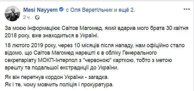 В более раннем посте Маси Найем  сообщал, что 18 февраля 2019 года, то есть через 10 месяцев после нападения на Найема, Саитов появился на учете Генерального секретариата Интерпола. Чеченцу присвоили "красную" карточку, которая подразумевает арест и последующую экстрадицию в Украину.