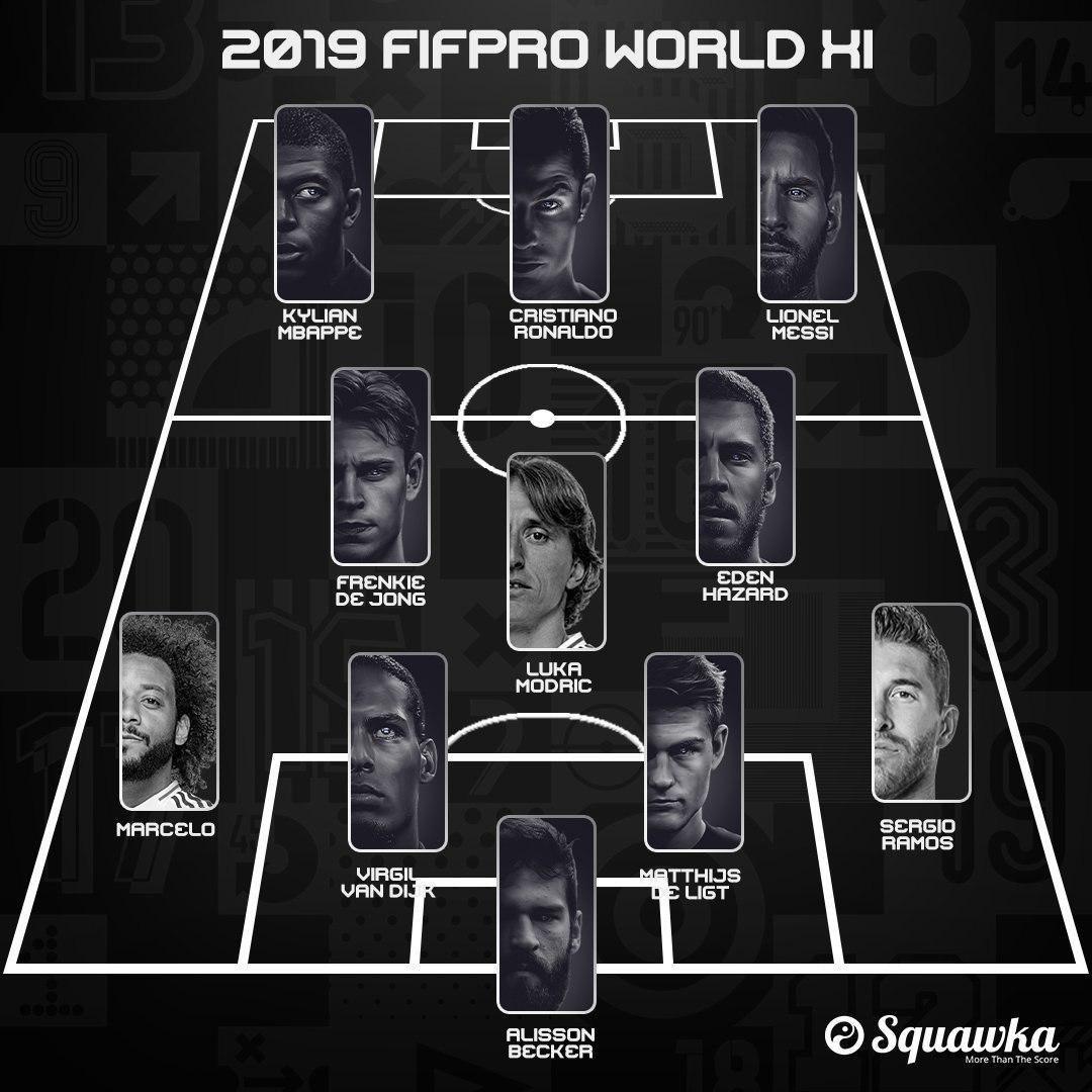 Команда года по версии ФИФА: Алиссон Беккер - защитники - Марсело, Вирджил ван Дейк, Маттейс де Лигт, Серхио Рамос - полузащитники - Френки де Йонг, Лука Модрич, Эден Азар - нападающие Килиан Мбаппе, Криштиану Роналду, Лионель Месси.