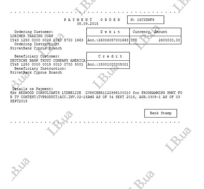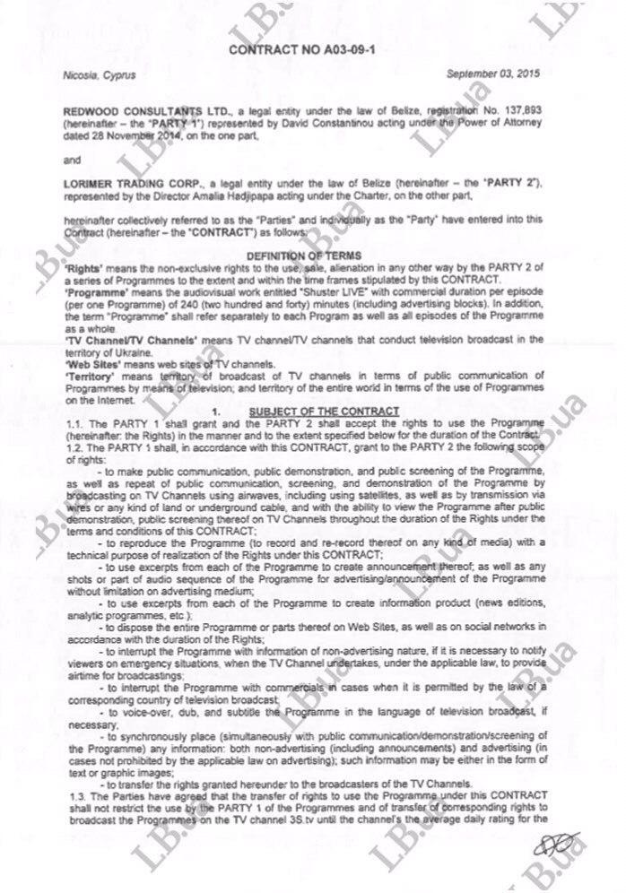"Субъекты - две "оффшорки" Белиза, с непонятным конечным бенефициаром (подписанты - номинальные директора). Первая как бы Коломойского. Вторая как бы Шустера. Имеет ли Игорь Коломойский отношение к "LORIMER TRADING CORP”? Напрямую, разумеется, нет. Речь, очевидно, о третьей стороне. "Мы заплатили", - прозвучало в эфире. К договору приложена платёжка - с фирмы на фирму - в 2600000,00 долларов США. Подразумевается: стороной Коломойского за программы, произведённые компанией Шустера. С разницей в несколько дней", - написала она.