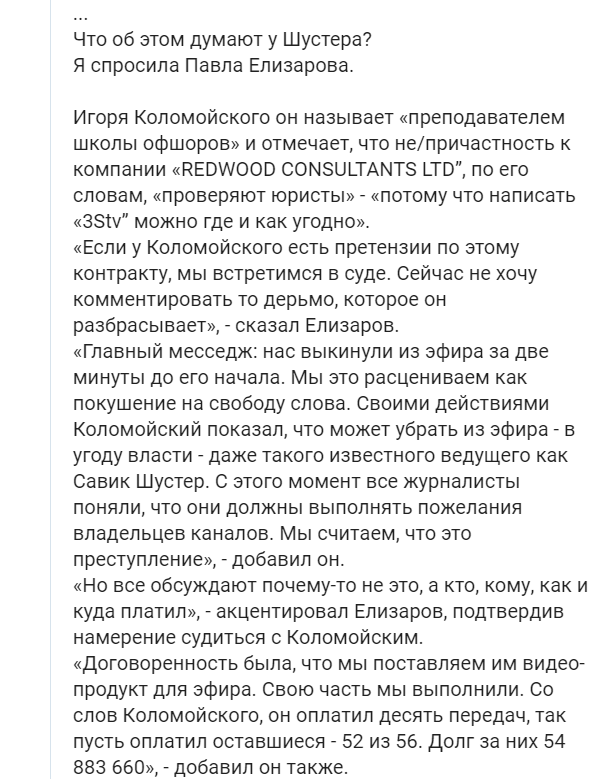 Кроме того, журналистка спросила мнение партнера Савика Шустера Павла Елизарова. Игоря Коломойского он называет "преподавателем школы офшоров" и отмечает, что не/причастность к компании "REDWOOD CONSULTANTS LTD”, по его словам, "проверяют юристы" - "потому что написать "3Stv" можно где и как угодно".
