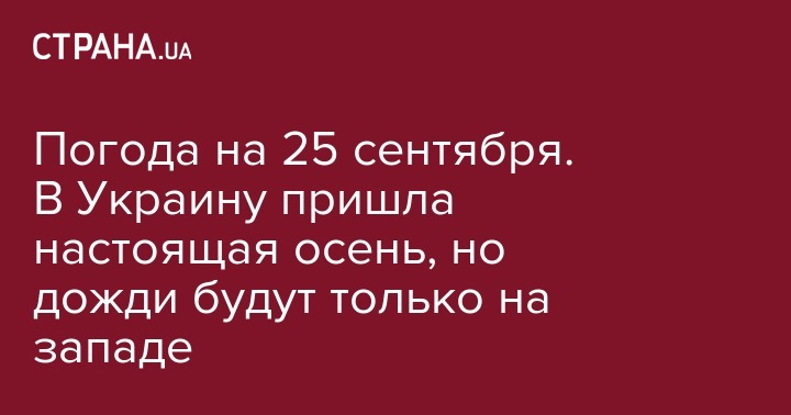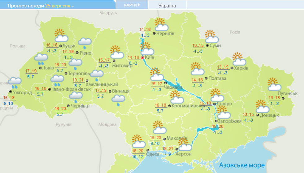В среду, 25 сентября, в отдельных регионах Украины прогнозируется холодная, по-настоящему осенняя погода. При этом сохраняется повышенная пожароопасность. Синоптики Укргидрометцентра прогнозируют небольшие дожди на западе страны.