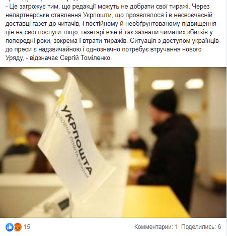 "Это грозит тем, что редакции могут не добрать свои тиражи. Из-за непартнерского отношения Укрпочты, которое проявлялось и в несвоевременной доставке газет читателям, и постоянном необоснованном повышении цен на услуги и т.д., газетчики уже и так понесли немалый урон в предыдущие годы, в том числе потеряли часть тиражей. Ситуация с доступом украинцев к прессе является чрезвычайной и однозначно требует вмешательства нового правительства", - отметил Сергей Томиленко.