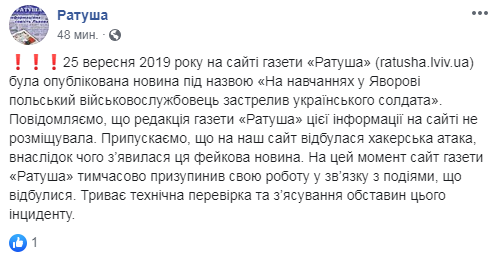 "25 сентября 2019 года на сайте газеты "Ратуша" (ratusha.lviv.ua) была опубликована новость под названием "На учениях в Яворове польский военнослужащий застрелил украинского солдата". Сообщаем, что редакция газеты"Ратуша" эту информацию на сайте не размещала. Предполагаем, что на наш сайт произошла хакерская атака, в результате чего появилась эта фэйковая новость. На данный момент сайт газеты "Ратуша" временно приостановил свою работу в связи с произошедшими событиями. Продолжается техническая проверка и выяснение обстоятельств этого инцидента", - говорится в опубликованном сообщении на фб-странице львовского издания.