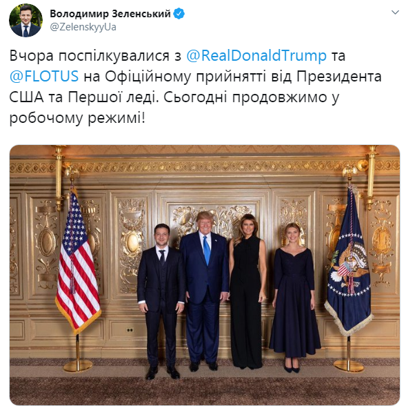 "Вчера пообщались с Дональдом и Меланией Трамп на официальном приеме от президента США и первой леди. Сегодня продолжим в рабочем режиме", - сообщается в опубликованном сообщении в твиттер-микроблоге Зеленского.