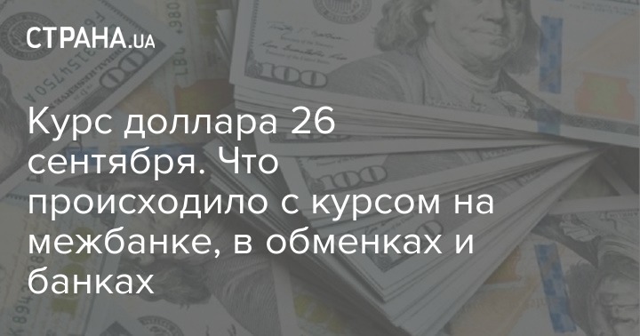 26 сентября НБУ снизил курс доллара на 8 копеек - до 24,12 грн. В обменках доллар вечером покупают за 24,10 грн, продают за 24,15 грн. Межбанк закрылся такими котировками: 24,09 грн - покупка и 24,12 грн - продажа. В банках вечером доллар покупают от 23,85 до 24,11 грн и продают от 24,11 до 24,70 грн. В Приватбанке стоимость валюты такая: покупка - 23,95 грн, продажа - 24,30 грн.