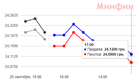 В 13:00 котировки были такие: 24,17 грн - покупка и 24,20 грн - продажа.