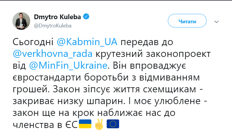 "Сегодня Кабинет министров передал в Верховную Раду очень крутой законопроект от Минфина. Он внедряет евростандарты борьбы с отмыванием денег. Закон испортит жизнь схемщикам - закрывает ряд щелей", - написал Кулеба.