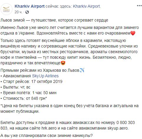 "Только здесь готовят вкуснейшие яблоки в карамели, настоящую вишневую наливку и согревающие настойки. Средневековые улочки из брусчатки, музыка из местных ресторанчиков, ароматы свежемолотого кофе и глинтвейна - тут повсюду кипит жизнь. Именно Львов уже много лет считается лучшим вариантом для зимнего отдыха в Украине. Вдохновляйтесь вместе с нами его очарованием", - обращаются к жителям и гостям города в Международном аэропорту "Харьков".