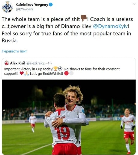 "Вся команда - кусок дерьма! Тренер - бесполезная #####, владелец - большой фанат киевского Динамо. Мне жаль истинных фанатов самой популярной команды в России", - написал Кафельников в Twitter, процитировав пост чеха.
