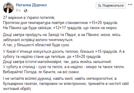 "Выбирайте! Погода, как видите, на все вкусы. И не читайте всякую ерунду, даже милую, даже метеорологическую, в бульварных газетах, бумажных или электронных, держите в чистоте свой жизненный горизонт", - написала Диденко.