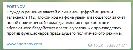 "Осуждаю решение властей о лишении цифровой лицензии телеканала 112. Плохой ход на фоне увеличивающегося за счёт новой политической команды влияния порохоботов и абсолютного бездействия власти в уголовных производствах против функционеров предыдущего политического режима", - написал он в своем Телеграм-канале.