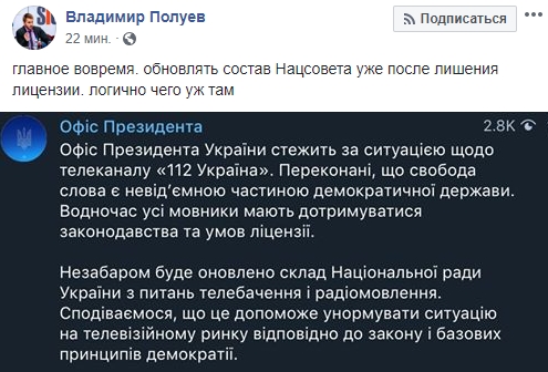 Телеведущий Владимир Полуев запостил скриншот реакции офиса президента на ситуацию и прокомментировал: "Главное вовремя обновлять состав Нацсовета уже после лишения лицензии. Логично, чего уж там".