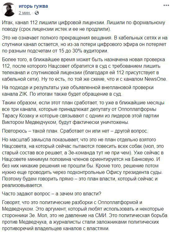 "Итак, канал 112 лишили цифровой лицензии. Лишили по формальному поводу (срок лицензии истек и ее не продлили). Это не означает полного прекращения вещания. В кабельных сетях и на спутники канал остается, но из-за потери цифрового эфира он потеряет по разным подсчетам от 15 до 30% аудитории.
