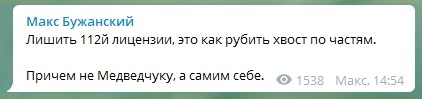 Фракция "Слуги народа" пока официального заявления не делала. Но народный депутат от "СН" Макс Бужанский осудил попытку закрыть канал: "Лишить 112й лицензии, это как рубить хвост по частям.