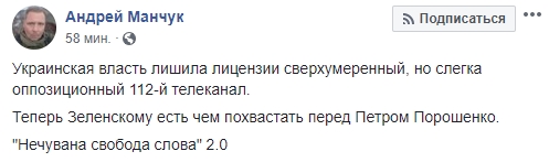 Журналист Андрей Манчук назвал происходящее "Нечуваной свободой слова 2.0": "Украинская власть лишила лицензии сверхумеренный, но слегка оппозиционный 112-й телеканал.