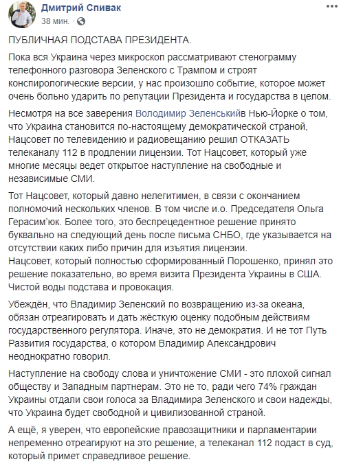 Политик и телеведущий Дмитрий Спивак назвал лишение канала 112 лицензии "публичной подставой президента": "Пока вся Украина через микроскоп рассматривает стенограмму телефонного разговора Зеленского с Трампом и строят конспирологические версии, у нас произошло событие, которое может очень больно ударить по репутации Президента и государства в целом.