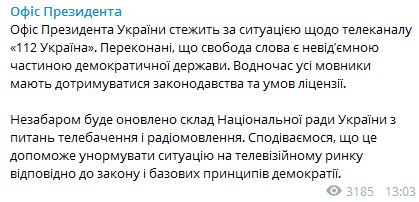 "Офис Президента Украины следит за ситуацией в отношении телеканала "112 Украина". Убеждены, что свобода слова является неотъемлемой частью демократического государства. В то же время все вещатели должны придерживаться законодательства и условий лицензии", - говорится в сообщении.