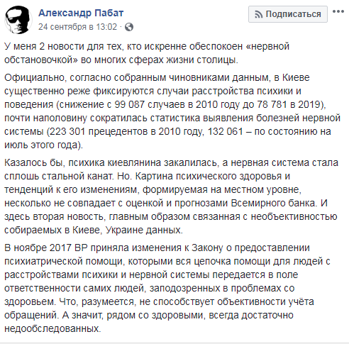 Об этом говорится на фб-странице депутата Киевсовета Александра Пабата 24 сентября 2019 года.