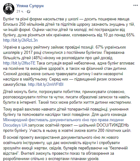 Команда Международного фестиваля документального кино о правах человека Docudays UA запускает образовательный проект - "Неделя против буллинга", поучаствовать в котором смогут  200 украинских школ. Об этом на своей странице в соцсети написала экс-глава Минздрава Ульяна Супрун.