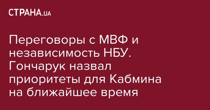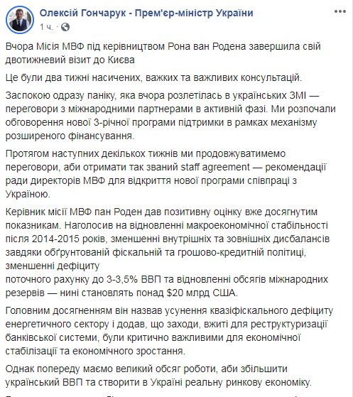 Премьер-министр Алексей Гончарук заявил, что обеспечение независимости Национального банка (НБУ) и защита финансовой стабильности остаются приоритетом для правительства в то время, как работа с МФВ по новой программе может начаться до 2020. Об этом он написал на своей странице в социальной сети Facebook.