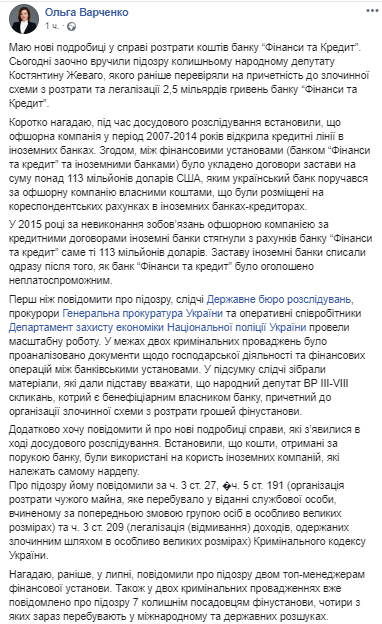 Госбюро расследований заочно вручило подозрение экс-нардепу Константину Жеваго, которого ранее проверяли на предмет причастности к схеме с растратой и легализацией 2,5 миллиардов гривен банка "Финансы и Кредит". Об этом на своей странице в соцсети сообщила первый заместитель председателя ГБР Ольга Варченко.
