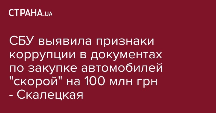 Служба безопасности Украины выявила признаки коррупции в документах по закупке автомобилей скорой помощи на сумму 100 млн гривен. Об этом в Facebook сообщила министр здравоохранения Зоряна Скалецкая.