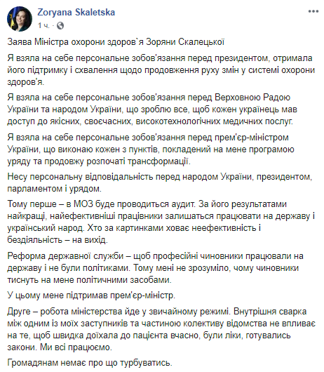 Она еще раз объявила о грядущем аудите в Минздраве, по результатам которого "лучшие, самые эффективные работники останутся работать на государство и украинский народ, а те, кто за картинкам прячет неэффективность и бездействие, - на выход".