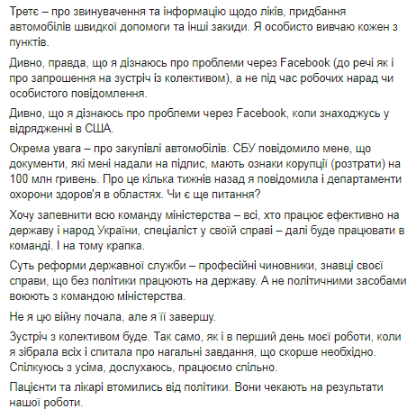 "СБУ сообщило мне, что документы, которые мне предоставили на подпись, имеют признаки коррупции (растраты) на 100 млн грн. Об этом несколько недель назад я уведомила департаменты здравоохранения в областях", - написала Скалецкая.