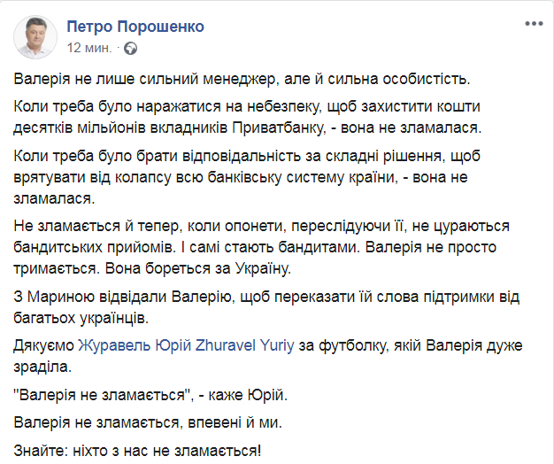 Свой пост Порошенко завершил на торжественной ноте: "Валерия не сломается, уверены мы. Знайте: никто из нас не сломается!"