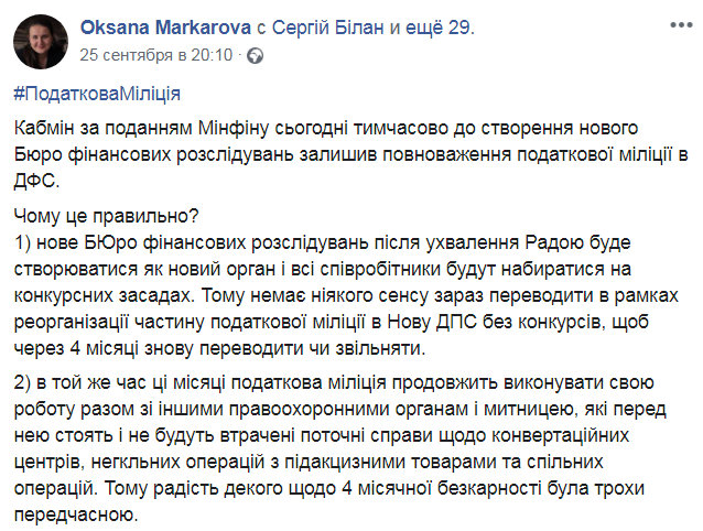 "Поэтому нет никакого смысла сейчас переводить в рамках реорганизации часть налоговой милиции в новую ГНС без конкурсов, чтобы через 4 месяца опять переводить или увольнять", - пояснила она на Facebook.
