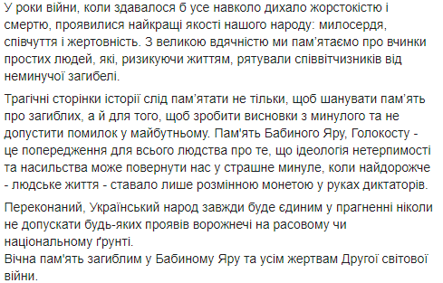 "Трагические страницы истории следует помнить не только, чтобы чтить память о погибших, но и для того, чтобы сделать выводы из прошлого и не допустить ошибок в будущем. Память Бабьего Яра, Холокоста - это предупреждение для всего человечества о том, что идеология нетерпимости и насилия может вернуть нас в страшное прошлое, когда самое дорогое - человеческая жизнь - становилось лишь разменной монетой в руках диктаторов", - отмечено в сообщении.
