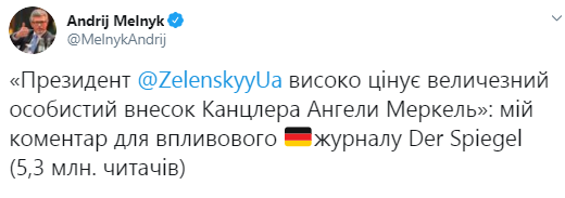 "Президент Владимир Зеленский высоко ценит огромный личный вклад канцлера Ангелы Меркель", – написал дипломат.