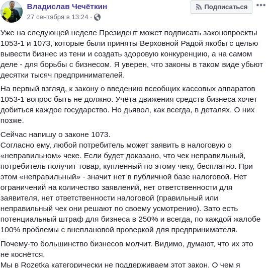 "Мы в Rozetka категорически не поддерживаем этот закон. О чем я публично высказался. После чего утром, в день голосования, "экономист" и один из главных "помощников" бизнеса Илья Несходовский, разместил статью, о "поддельных" чеках Rozetka. Этот материал активно разгонялся по информационному пространству и использовался для того, чтобы убедить депутатов в необходимости принятия закона" - написал Чечёткин.
