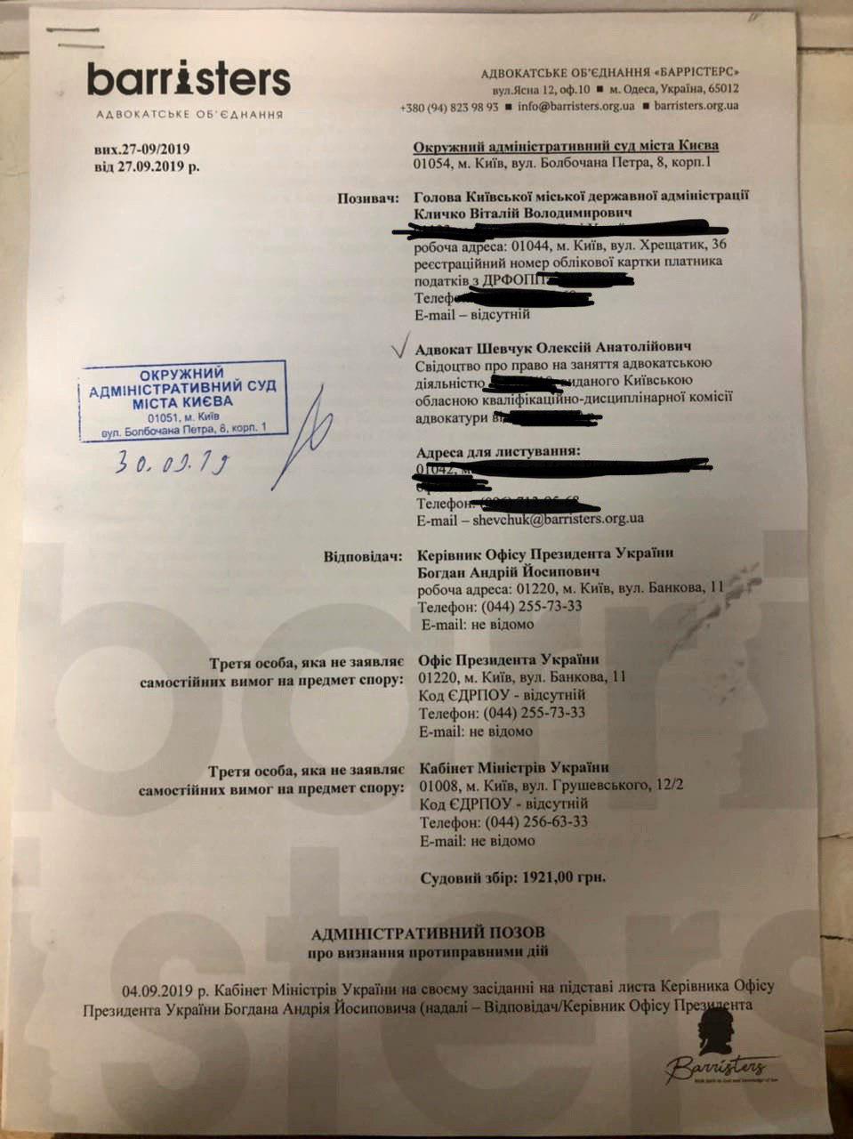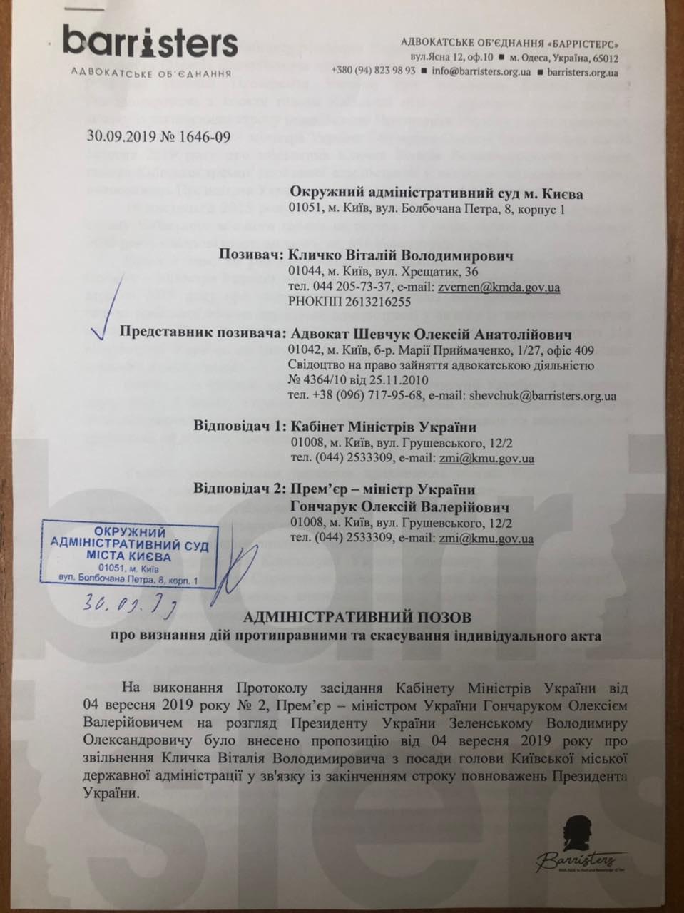 Кличко подал в суд на Богдана, Кабмин и Гончарука из-за решения о его увольнении с поста главы КГГА. Документ
