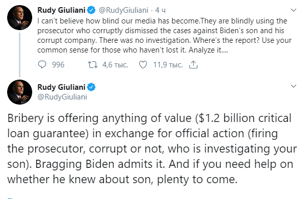 "Взяточничество подразумевает предложение чего-либо ценного (гарантия критически важного займа в $1,2 млрд) в обмен на официальные действия (увольнение прокурора коррумпированного или нет, который расследует дело против твоего сына). Хвастун Байден признался в этом. Если вам нужна помощь насчет того, знал ли он о сыне, вскоре вы многое узнаете", - написал Джулиани.