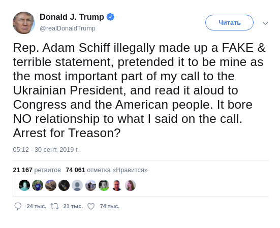 "Представитель Адам Шифф незаконно составил фейковое и ужасное заявление, представив его как мое, как наиболее важную часть моего разговора с президентом Украины, и зачитал его Конгрессу и американскому народу. Это не соответствовало тому, что я сказал по телефону. Арестовать за госизмену?" - написал Трамп.