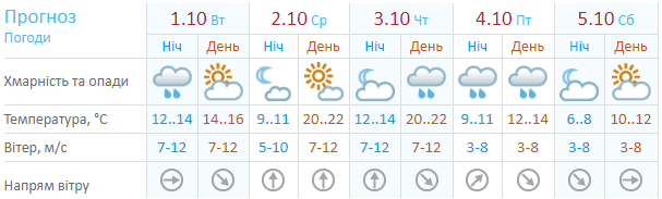 Похожую картину рисует и Gismeteo. 1 октября, сегодня, дождь и до +15. Во вторник потеплеет до +21, солнечно. В среду +22, возможна гроза. Грозу обещают и в пятницу, 4 октября, а также похолодание до +11. На выходных в Киеве +11...+12, вероятны осадки.