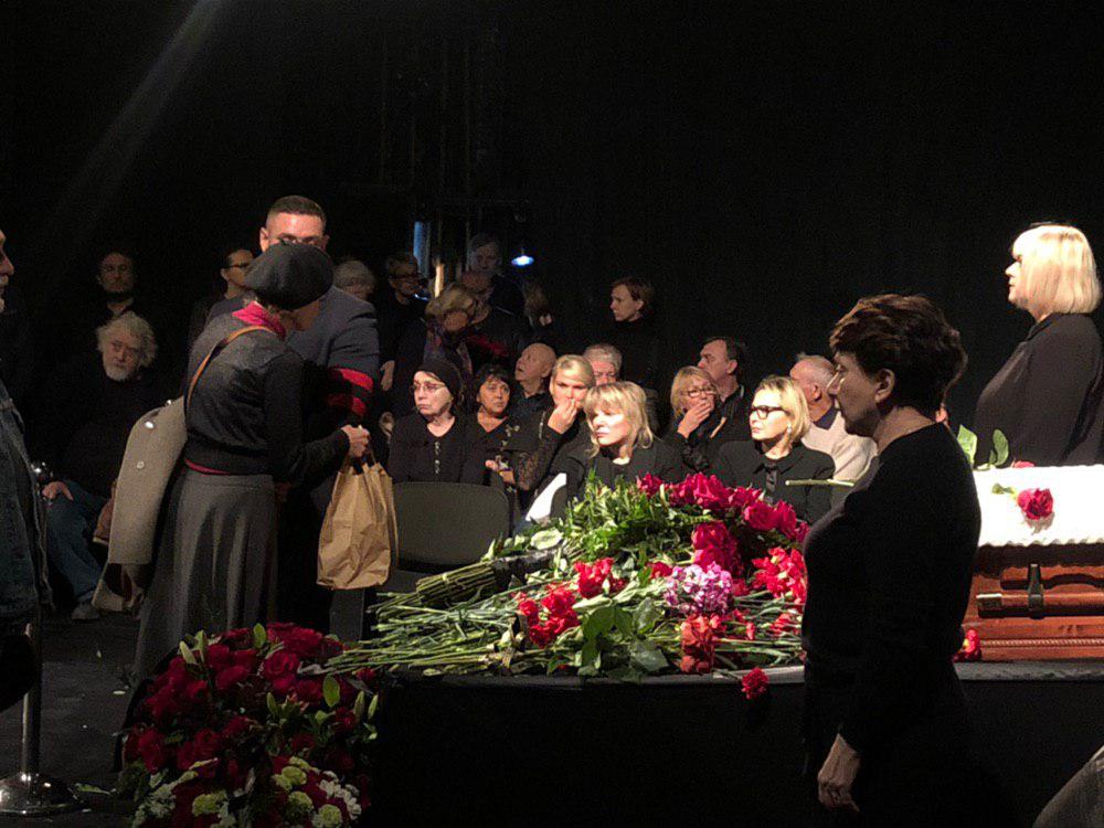 На этом прощание с Захаровым завершилось, люди покидают театр. Часть присутствующих осталась в фойе, чтобы проводить режиссера аплодисментами.