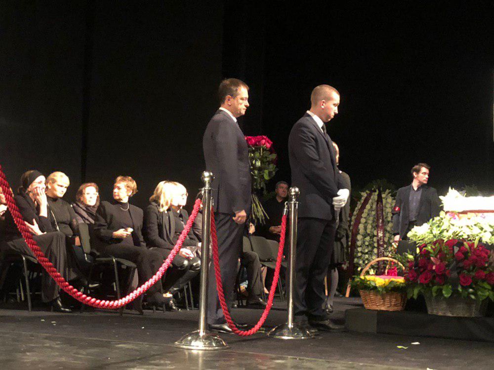 В самом начале церемонии пришел министр культуры РФ Владимир Мединский. Он положил к гробу букет роз и сел рядом с близкими покойного. Вскоре пришел мэр Москвы Сергей Собянин, он поцеловал дочь Захарова Александру, высказал ей слова соболезнования и они с Мединским вместе ушли.